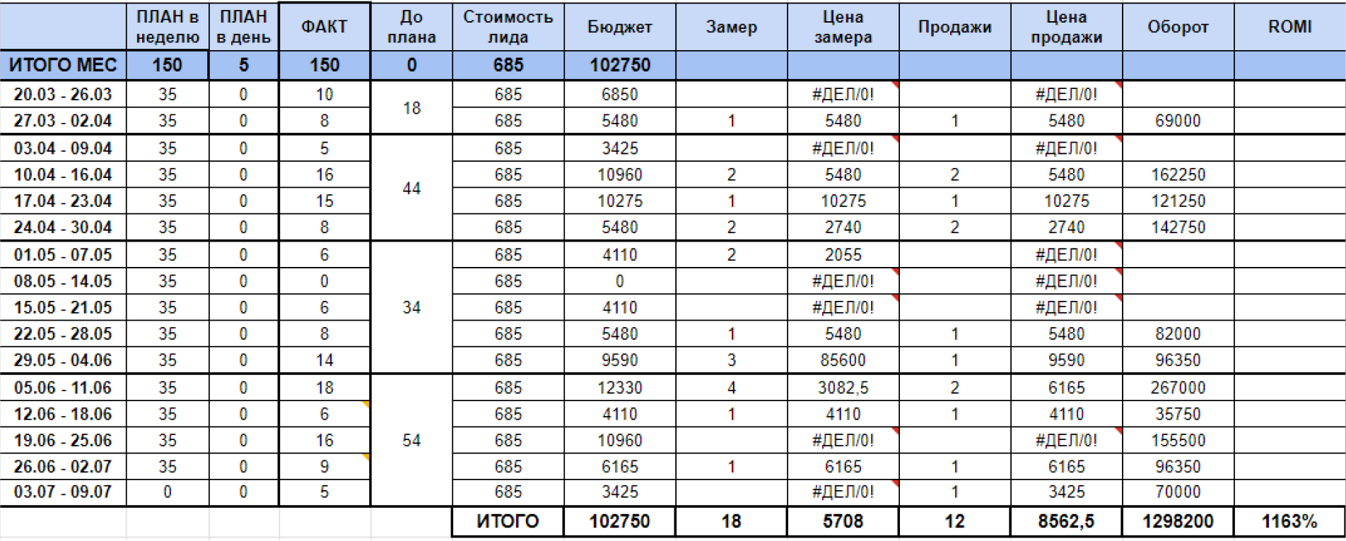 • в отчете можно увидеть количество лидов, замеров и договоров